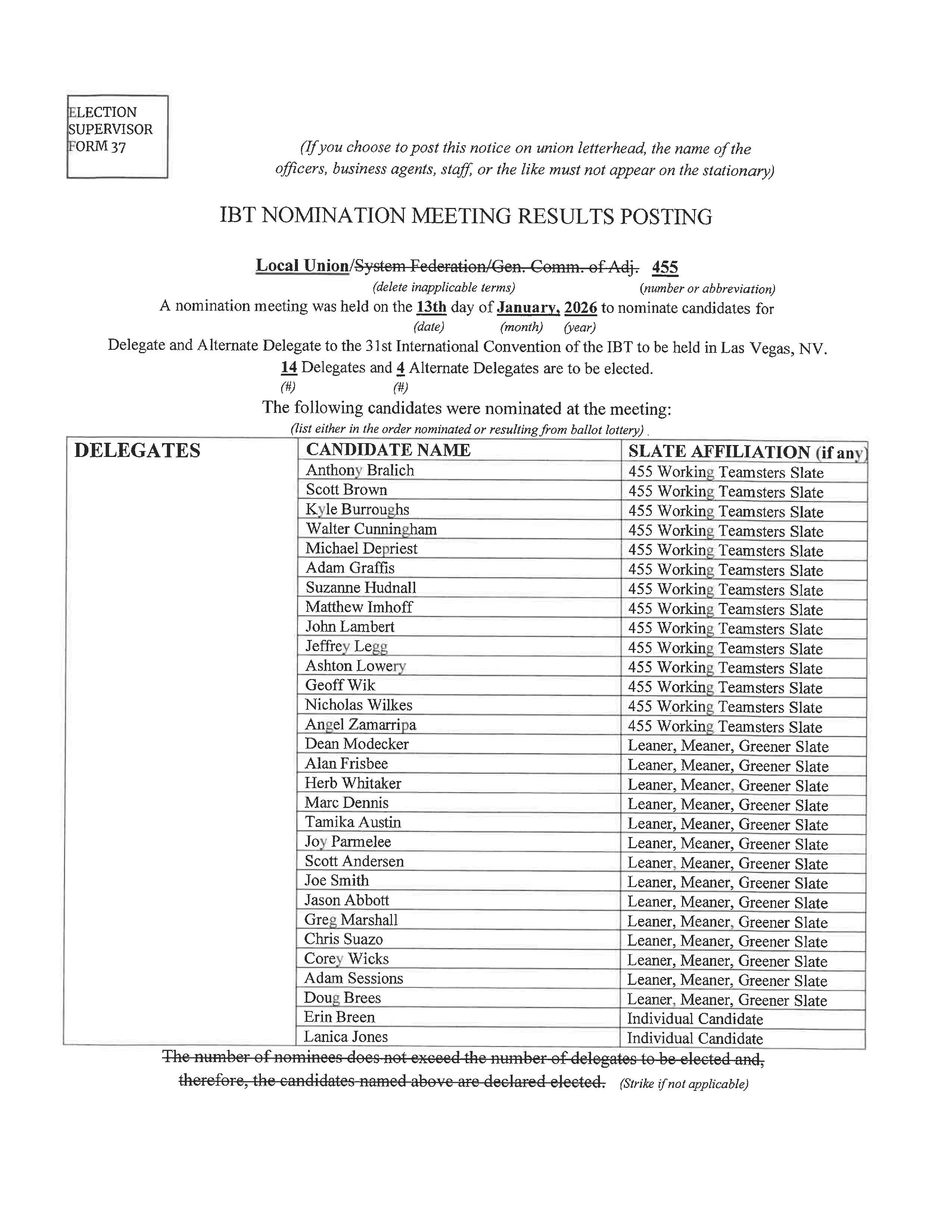 Teamsters Local 455 members will elect delegates to the 2026 International Brotherhood of Teamsters Convention by secret mail ballot. Please review the delegate election notice and nominees for 14 delegate and four alternate positions.